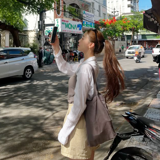 셔츠는 햇살이 비치면 살짝 비침이 느껴지는 시원한 소재. 루즈한 핏 덕분에 바람에 살랑이는 느낌이 살아 있다. 민소매는 바디에 적당히 밀착돼 깔끔한 인상을 주며, 팬츠는 하이웨이스트 디자인으로 활동성과 안정감 둘 다 잡았다.