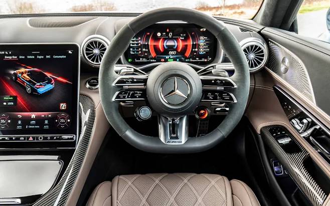 실내는 메르세데스 최신 MBUX 시스템과 AMG 전용 디스플레이가 결합되어 고급스러운 동시에 하이테크한 분위기를 제공한다. 디지털 클러스터는 하이브리드 에너지 흐름, 출력 분배, 배터리 상태 등을 실시간으로 제공하며, 센터 디스플레이는 드라이브 모드 조작 및 퍼포먼스 설정이 직관적으로 가능하다.