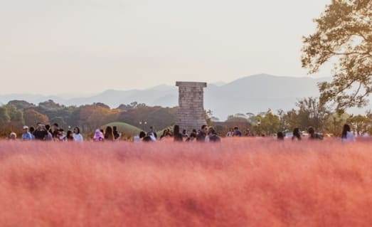 경주 핑크 뮬리 군락지는 앱이나 필터 없이 사진을 핑크로 물들일 수 있는 곳으로 사진을 찍으면 마치 동화 속 주인공이 된것 같은데요. 억새의 일종인 핑크 뮬리의 개화 시기는 9월~11월 사이로 이때 핑크 색이 절정을 이룹니다.