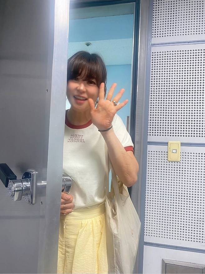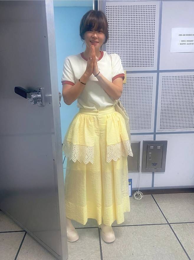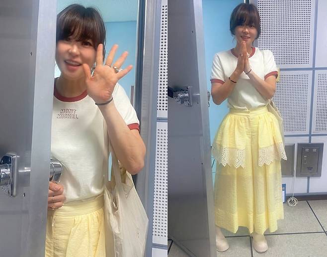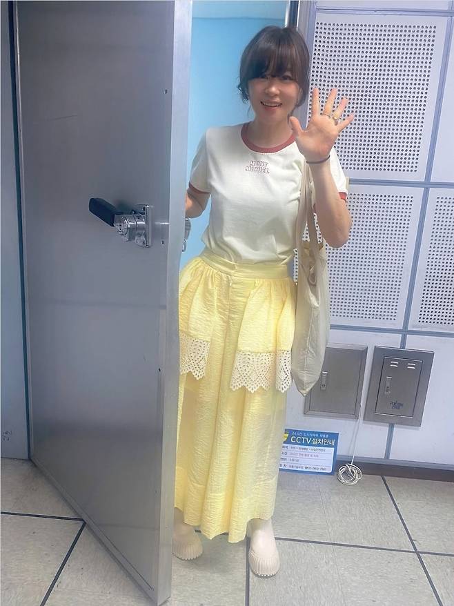 최강희는 크림 톤의 라운드 티셔츠에 노란빛이 감도는 시스루 롱스커트를 매치하며 따뜻하고 사랑스러운 데일리룩을 완성했습니다.
