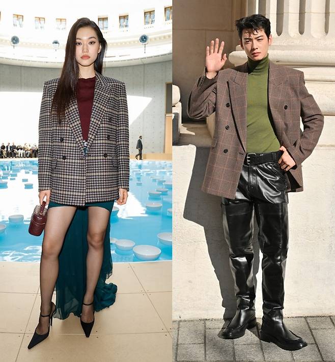 이날 김도연은 클래식한 체크 재킷과 꼬리를 길게 늘어뜨린 그린 시스루 스커트를 매치한 극과 극의 반전 체크룩을 선보였다. 차은우는 클래식한 체크 재킷과 블랙 가죽 팬츠를 매치한 강렬한 체크룩으로 시선을 사로잡았다.