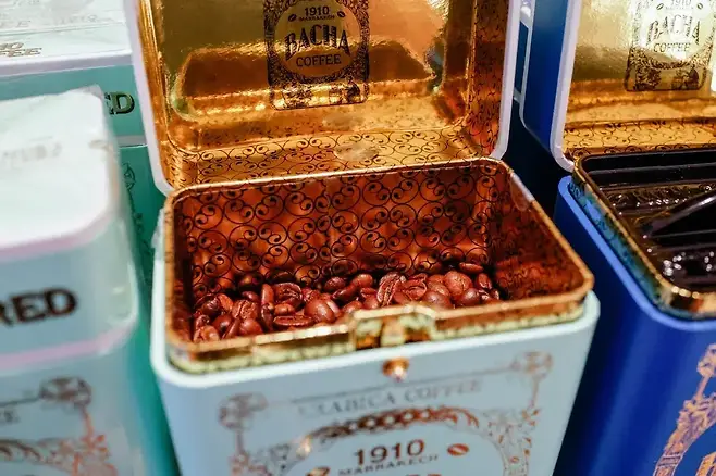간단히 커피 제품을 정리하면(커피 종류가 너무 많아서 혼란스럽다는 의견이 많았다.) 첫 번째는 가향커피. 바샤커피의 가장 대표적이고 대중적인 제품들이다. 총 10가지 정도의 가향커피가 있는데 캐러멜, 초콜릿, 과일 계열의 향미를 중심으로 가향한 커피들이다. 가향 커피의 원두 가격은 250g 기준으로 6만 2,000원. 원두 커피는 견고한 틴케이스에 담아서 제공한다.
