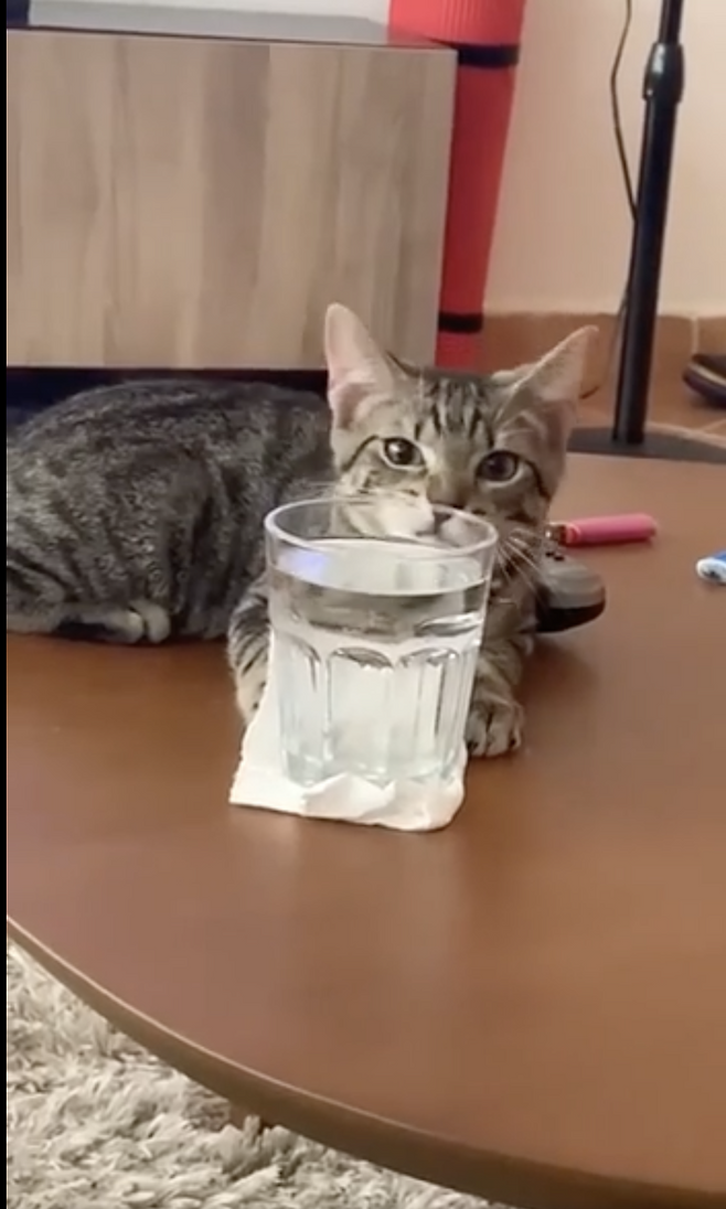 할짝거리다 주인을 바라보는 것이 무언가 할 것 같기도 합니다. 주인은 고양이의 눈빛에 불안하지만, 가만히 두었습니다. 이내 고양이는 컵 밑에 있던 냅킨을 당겼습니다. 그다음은 모두가 예측할 수 있는 일이 벌어졌습니다. 물이 전부 쏟아져 버려 고양이는 도망가 버렸습니다. 물을 마시려고 했던 행동은 아녔던 것 같네요.