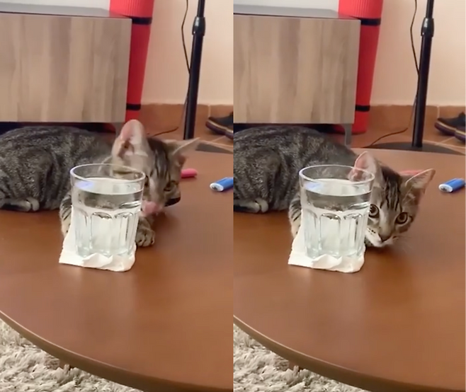 목이 말랐는지 테이블 앞에 있는 물컵에 엎드린 고양이가 있습니다. 고양이는 물컵에 담긴 물이 마시고 싶은지 혀도 날름거리고 냄새도 맡아보았는데요. 물을 마시려면 위에서 마셔야 하는데 그걸 몰랐던 것 같습니다. 아니면 물을 마시려던 게 아니었을까요?