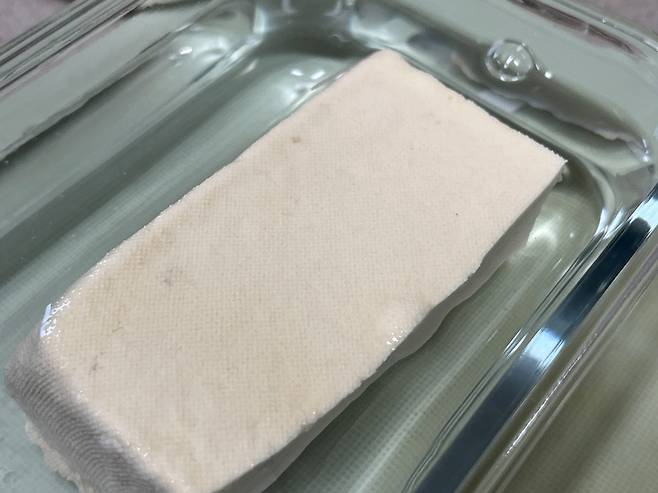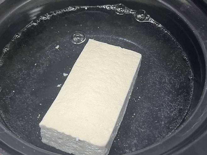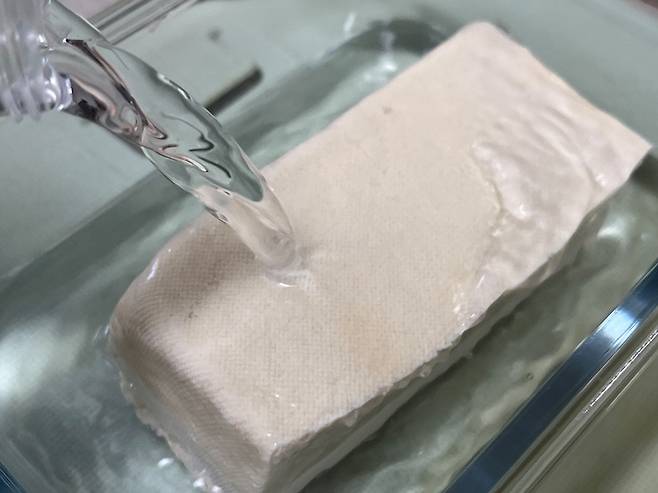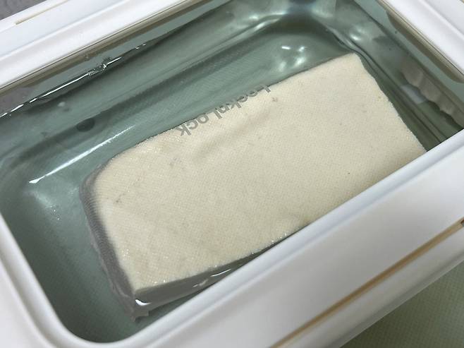 그리고 두부가 충분히 잠길 만큼 생수를 붓습니다. 물에 푹 담가 보관하면 두부의 촉촉한 식감과 신선한 맛을 오래 유지할 수 있습니다.