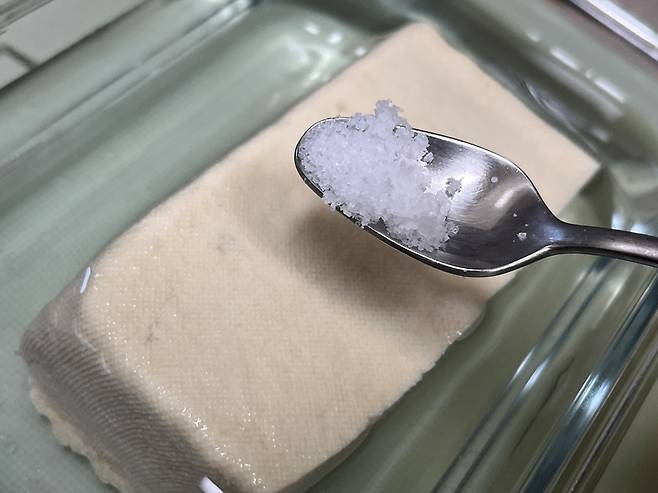 여기에 소금을 소량 넣으면 더욱 신선하게 두부를 보관할 수 있습니다. 소금은 살균 및 항균 효과가 있기 때문에 세균이 증식하는 것을 억제합니다. 소금은 두부 반모를 기준으로 커피스푼 1/2개 넣습니다.
