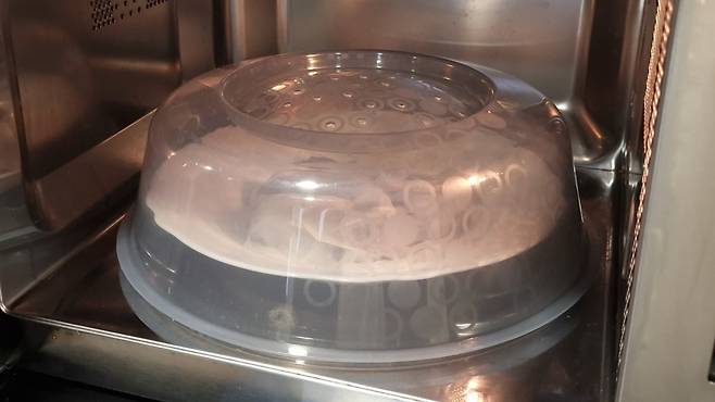 전자레인지에 넣고 뚜껑으로 덮거나 랩으로 씌워 놓으세요. 그래야 수분이 도망가지 않고 맛있는 밤을 찔 수 있게 해 준답니다.