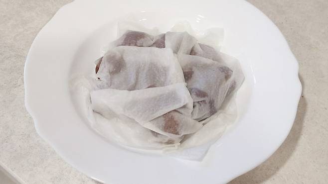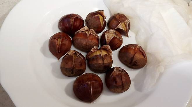 키친타월에 물을 완전히 축축하게 적시세요. 이후 키친타월로 밤을 덮어 줍니다. 이렇게 한 후 전자레인지에서 찌게 되면 촉촉한 밤을 드실 수 있어요.