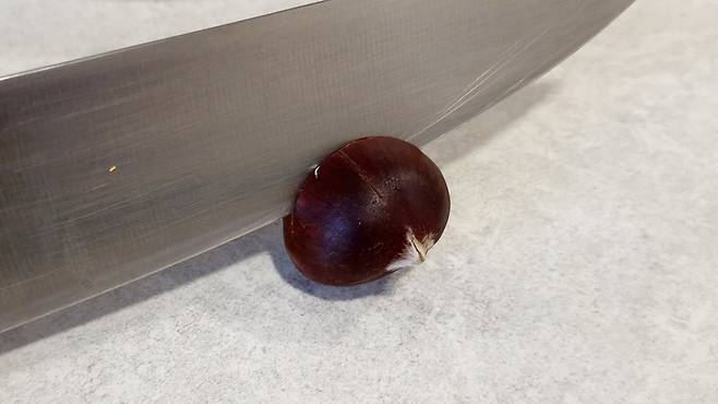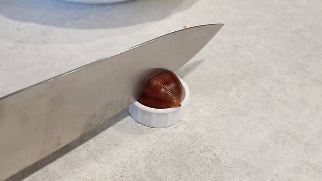 그리고 평소와 같이 밤을 잘라 주세요. 그러면 밤을 자를 때 튀지 않고 일정한 간격으로 칼집을 넣을 수 있답니다.