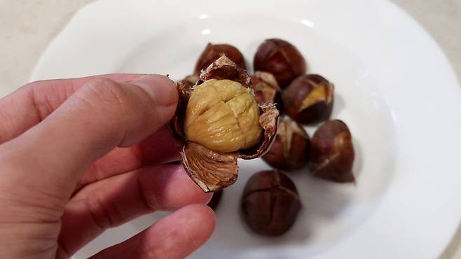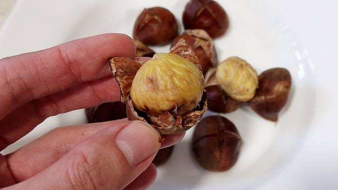 칼집을 넣은 부분이 모두 입을 열어 아주 쉽고 간단하게 밤 껍질을 제거할 수 있었답니다. 힘주지 않아도 알맹이만 쏙쏙 빠져나와요.