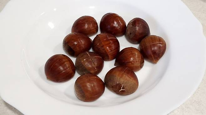 접시 위에 칼집을 넣은 밤을 모두 올려 줍니다. 이때 겹치지 않게 올리는 것이 중요해요.