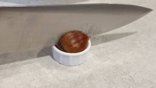 밤을 삶거나 찌기 전 볼록한 부분에 + 열십자 모양을 내주면 되는데요. 이때 칼로 자르면 밤이 이리저리 튈 수 있어 쉽지 않아요.