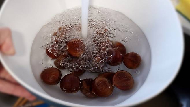 먼저 밤을 먹을 만큼 준비하세요. 그리고 깨끗이 씻어 놓습니다. 이물질이 껍질에 많이 묻어 있어 깨끗이 닦는 것이 좋아요.