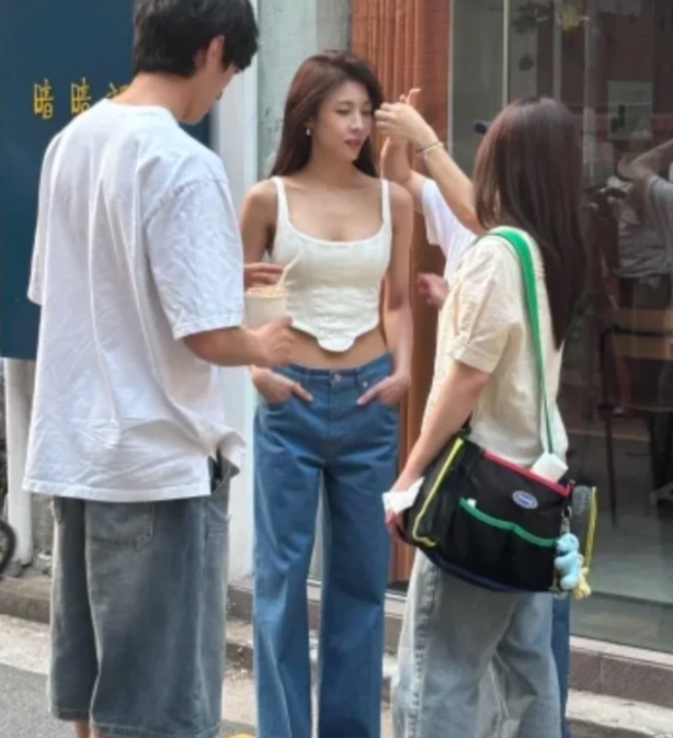 하의는 골반에서 떨어지는 일자핏 데님 팬츠로, 편안하면서도 세련된 느낌을 주었어요. 일자핏 팬츠는 너무 넓지도, 너무 좁지도 않은 자연스러운 실루엣을 만들어주어, 다리 라인을 더욱 길고 슬림하게 만들어줍니다. 골반에서 떨어지는 핏이 전체적인 룩에 여유롭고 캐주얼한 느낌을 더해주며, 클린한 느낌의 화이트 뷔스티에와 잘 어울렸어요.