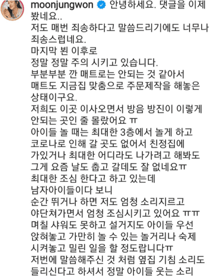 이어 "사과의 의미로 선물도 전달하고, 아이들과 함께 가서 사과 했으나 마음이 풀리지 않는 것 같아 속상하다"면서 "남자 아이들이라 통제가 어렵다, 건물 구조상 해결되지 않는 문제다, 맞춤형 매트를 주문해놓은 상태다"라고 덧붙였습니다.