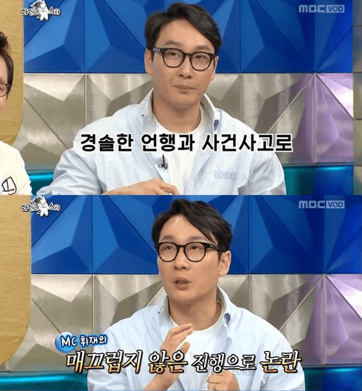 전성기를 보내던 2006년, '상상플러스'에서 정형돈에게 몰래 가운데 손가락을 들어보이는 모습이 그대로 방송에 송출되면서 비호감 이미지를 얻기도 했으나, "편안한 분위기에서 녹화가 진행되다 보니 무의식 중에 한 실수였다"라고 사과하며 논란을 잠재웠습니다.