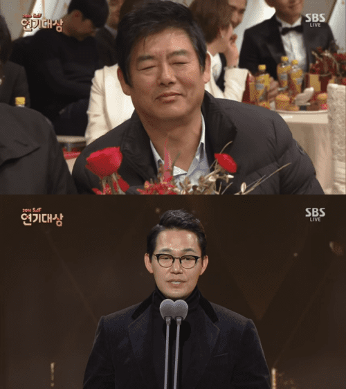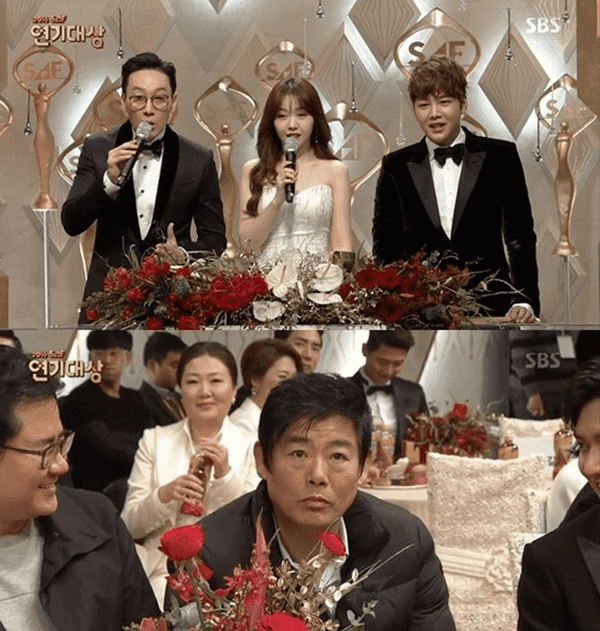 이어 바로 이어진 수상에서 무려 20년 만에 처음으로 상을 받은 배우 박성웅이 수상 소감을 얘기하던 중 "성동일 선배가 연기가 늘었다는 칭찬을 해주었다"라고 성동일을 언급하자, 박성웅이 소감을 말하는 도중에 마이크에 대고 큰 웃음소리를 내거나 성동일에게 "동일이 형, 감독님(PD) 맞네!"라고 끼어들며 또다시 면박을 주었습니다. 이로 인해 박성웅은 난처한 표정으로 잠시 동안 소감을 멈추고 기다려야만 했습니다.