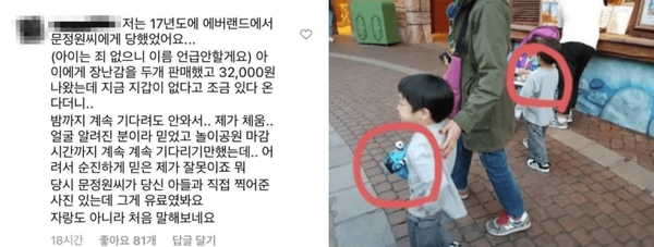 그는 “얼굴 알려진 분이라 믿었고 놀이공원 마감시간까지 계속 기다리기만 했는데 어려서 순진하게 믿은 제가 잘못”이라며 “당시 문정원 씨가 당신 아들과 직접 찍어준 사진도 있는데 그게 유료였나 보다”라고 했습니다.