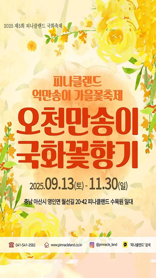 피나클랜드의 하이라이트는 단연 계절 축제다. 2025년 가을, 다섯 번째를 맞는 ‘오천만송이 국화꽃향기 축제’는 9월 13일부터 11월 30일까지 두 달 넘게 이어진다. 약 107,300㎡에 달하는 광활한 공간을 국화와 코스모스가 물들이며, 그 장관은 가을 여행지로서의 매력을 극대화한다.