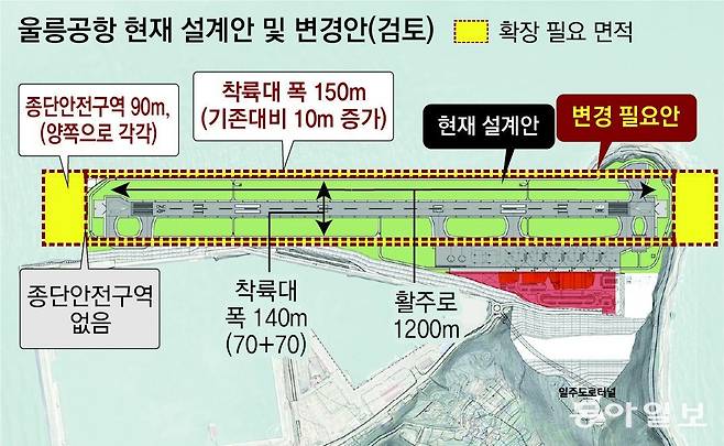 국토교통부 측은 현재로서는 시계 비행이 최선의 대안이라는 입장이다. 울릉공항은 활주로 내륙 쪽으로는 산으로 둘러 싸여 있고, 반대쪽으로는 바다와 연결돼 있다. 활주로 폭이나 길이를 늘이려면 바다를 매립해야 하기 때문에 수천 억 원의 비용이 더 들어간다. 공사비가 더 들어가면 예비타당성 조사를 다시 받아야 한다.