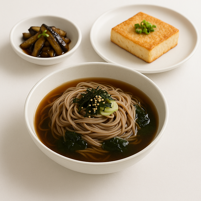 2. 냉메밀국수 + 두부스테이크 + 구운 가지무침