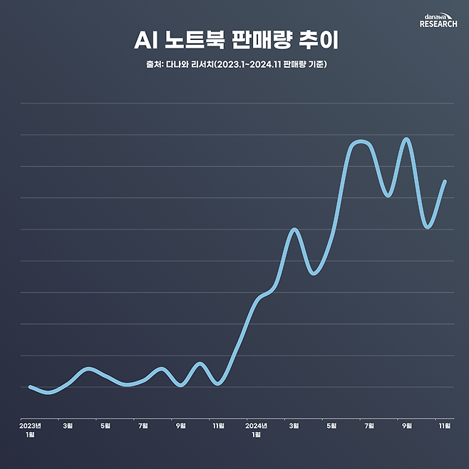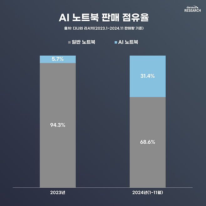 2024년 현재, 전체 노트북 중 AI 노트북이 차지하는 비중은 얼마나 될까? 다나와 리서치 기준 2023년에는 전체 판매량 중 AI 노트북의 점유율이 5.7%에 불과했다. 그런데 2024년 1월부터 11월까지의 데이터에 따르면, 전체 판매량 중 AI 노트북 비율이 무려 31.4%로 급증했다. 이는 실질적으로 다나와에서 판매 집계된 노트북 10대 중 3대가 AI 노트북이라는 뜻이다.