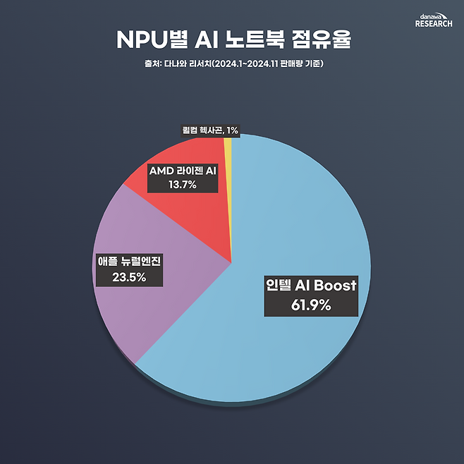 AI 노트북에서 NPU는 각 브랜드에서 다양한 이름과 형태로 구현되고 있다. 다나와 리서치에 따르면, 인텔 CPU 제품군이 전체의 61.9%를 차지하며 압도적인 점유율을 기록했다. 이어 애플 뉴럴엔진과 AMD 라이젠 AI가 뒤를 이었고, 퀄컴 헥사곤은 점유율이 1%에 그쳤다.