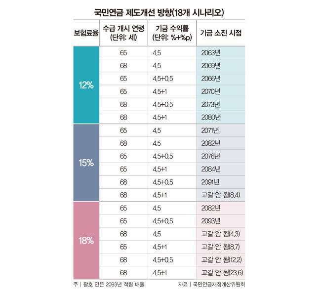 몇 가지 시나리오를 살펴보면 이렇다. 먼저 현재 운영 중인 보험료율 9%에 수급 개시 연령 65세를 유지하면 기금은 2055년 고갈된다. 다음으로 보험료율을 12%, 수급 개시 연령을 68세로 개선하고 기금 운용수익률을 1%p 높이면 고갈 시점은 2080년이 된다. 또 보험료율을 15%, 수급 개시 연령을 68세로 바꾸고 기금 운용수익률을 1%p 개선하면 고갈 시점은 2093년 이후가 된다. 만약 연금 수급 개시 연령을 65세로 유지하고 운용수익률 인상을 보수적으로 0.5%p로 잡으면 보험료율을 18%로 높여야 고갈 시점이 2093년 이후로 늦춰진다.2093년을 기준으로 살펴보는 이유는 재정계산위원회가 '연금 추계 기간(70년)인 2093년까지 국민연금 적립기금이 고갈되지 않도록 한다'는 목표를 제시했기 때문이다. 김용하 재정계산위원장(순천향대 IT금융경영학과 교수)은 "보험료율을 12%로 높이는 안은 연금을 70년 이상 지속시키지 못하고, 18%로 인상하는 안은 재정 안정 효과는 확실하지만 고소득층은 낸 돈보다 덜 받는다는 한계가 있다"고 설명했다. 결국 재정계산위원회가 원하는 방안은 '보험료율을 15%로 올리고 수급 개시 연령을 68세로 늦추며 기금 운용수익률을 1%p 높이는' 것으로 보인다.