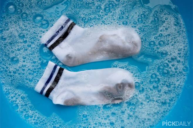 미지근한 물에 주방세제와 과탄산소다를 풀어 잘 녹여준 뒤, 양말을 20~30분 정도 담가두면 찌든 때가 불어나 제거하기 쉬워진다. 이후 조물조물 세척하거나 솔로 문지른 후 깨끗하게 헹궈 마무리한다. 다만 과탄산소다는 표백력이 강해 컬러 양말에는 사용하지 않는 것이 좋고, 고무장갑을 착용 후 만지는 것이 좋다.