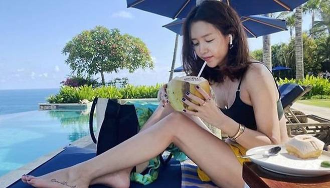 사진 속 채정안은 비키니 수영복을 입은 채 코코넛 주스를 마시고 있었습니다. 귀에 꽂은 에어팟과 발 타투 역시 눈에 띄었죠.