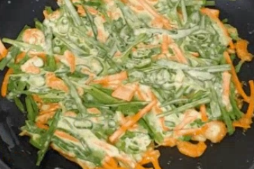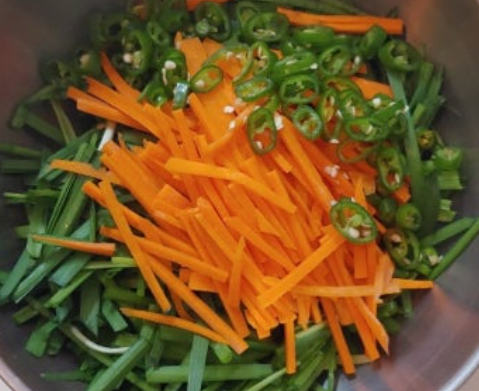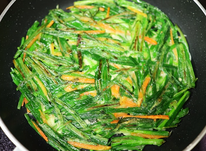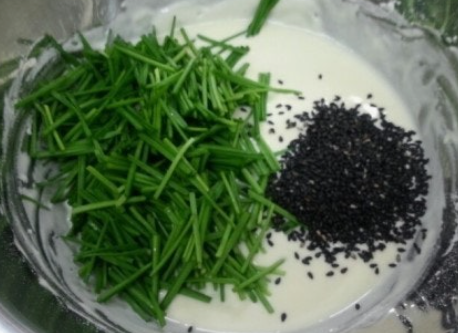 기본 부침개 반죽에 이 세 재료를 넣을 때는 흑임자 1큰술, 당근 1/2개(채썬 것), 부추 한 줌 정도가 적당합니다.