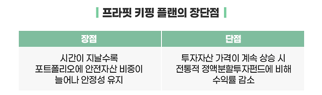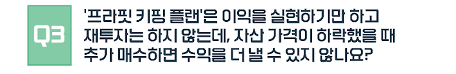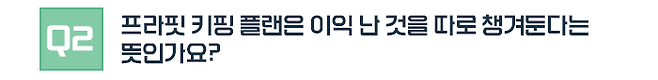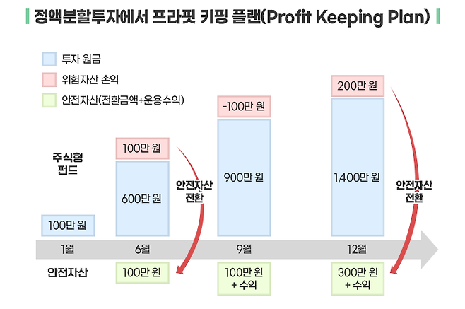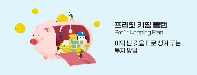 이 같은 방식으로 목표 수익률을 초과하는 이익이 발생할 때 마다 이익금을 예금 등 안전자산으로 전환해 이익을 보존하는 투자 방법이 바로 ‘프라핏 키핑 플랜’입니다.