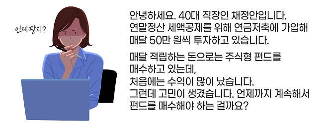 웬만큼 이익이 났으면 펀드를 매도해서 수익을 실현하고 싶은데, 언제 팔아야 할지 모르겠네요. 매달 일정한 금액을 투자해서 매수하는 적립식 투자 방법이 좋기는 한데, 언제 매도해야 할지 모르니 답답하네요.