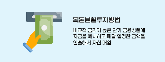 목돈을 비교적 금리가 높은 단기 금융상품(MMF, MMDA, CMA 등)에 자금을 예치하고 매달 일정한 금액을 인출해서 자산을 매입하는 방법인데요.