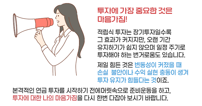 예를 들어 퇴직금으로 한꺼번에 주식형 펀드에 투자했는데, 하락장을 맞이하면 손실을 피하기 어려울 겁니다.