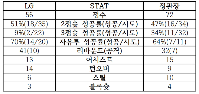 반면, LG는 두 외국 선수(아셈 마레이-마이클 에릭)이 32점 20리바운드를 합작했지만, 국내 선수들의 지원사격이 부족했다. 압박이 강한 팀에 약한 면모를 그대로 드러내며 공격 흐름이 뻑뻑했고, 외곽슛도 말을 듣지 않은 것이 패인이었다.