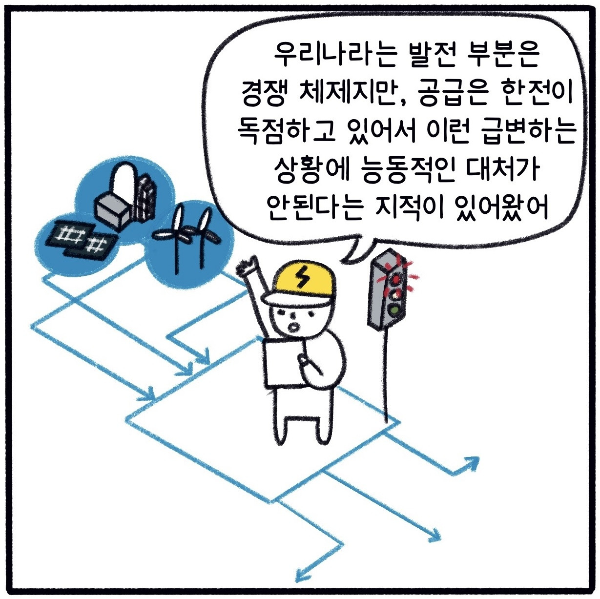2001년 전력 산업 구조 개편으로 발전 부문은 분할이 됐고, 이후 신규 발전 진입도 가능해져 형식적으로는 경쟁 체제가 가능한 구조다. 그러나 발전으로 만든 전기를 나르고 배분하고 판매하는 계통(grid)은 여전히 한전이 독점하고 있다.