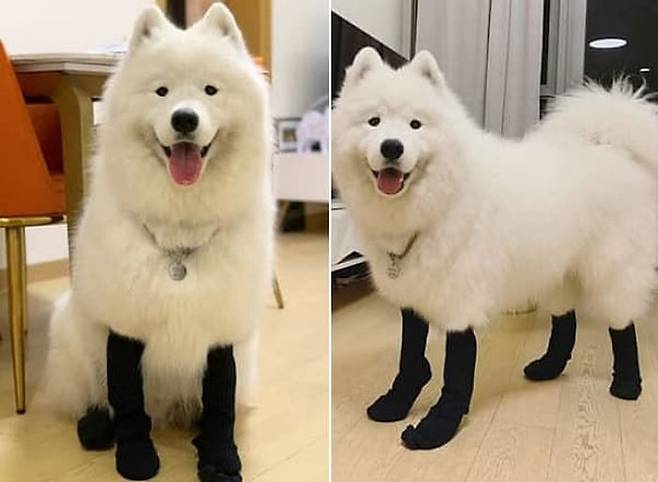 무엇보다 눈길을 사로잡게 하는 것은 사모예드 강아지 우동의 다리였는데요. 새하얀 털 대신 검정 양말을 신고 있었는데요.