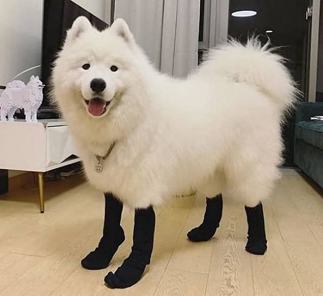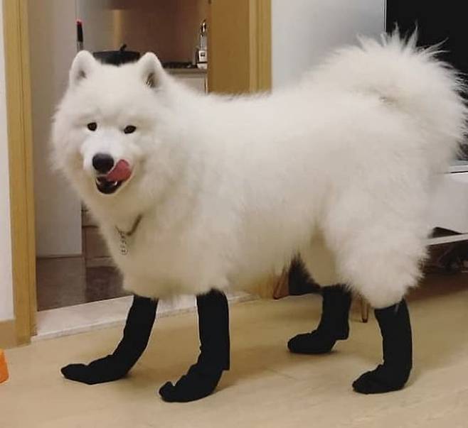 두툼한 털로 무장한 발목 대신 검정 양말을 신어서 순간 양이 아닌가 착각을 들게 만드는 사모예드 강아지 모습이 공개돼 보는 이들을 웃음 짓게 합니다.