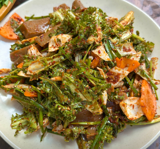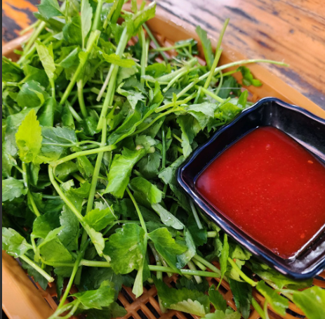 이 집만의 포인트라고 할 수 있는 구성으로, 신선한 미나리를 초장에 찍어 그대로 즐길 수 있어 미나리 본연의 향을 제대로 느낄 수 있습니다.