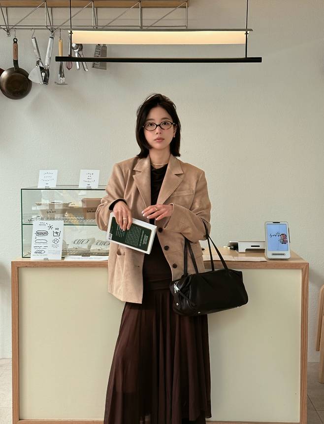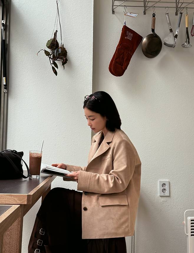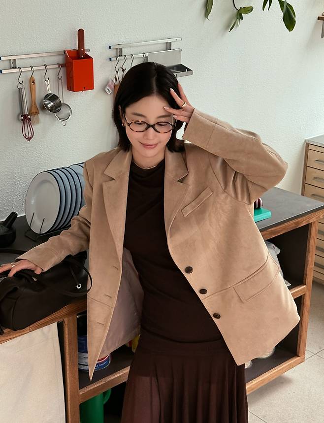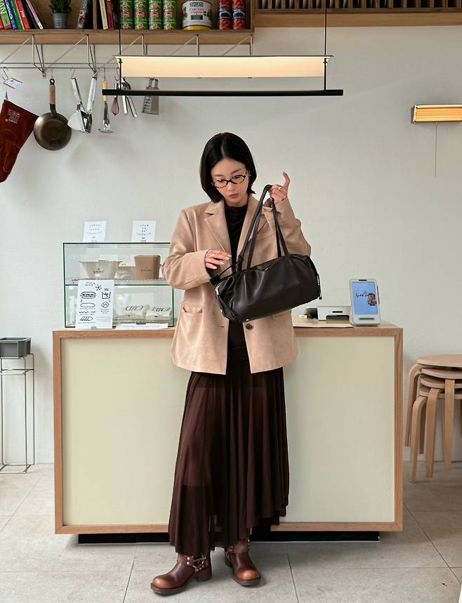 기은세가 보여준 이번 스타일은 차분한 브라운과 베이지 톤의 배색을 활용해 지적이고 우아한 아우라를 자아내는 스웨이드룩이에요.