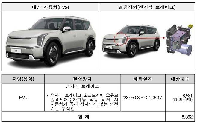 또 기아 EV9 순수전기차 총 8592대는 전자식 브레이크 소프트웨어 오류로 원격제어주차기능이 정상 작동되지 않는 안전기준 부적합이 확인되어 이번 리콜에 포함된다.