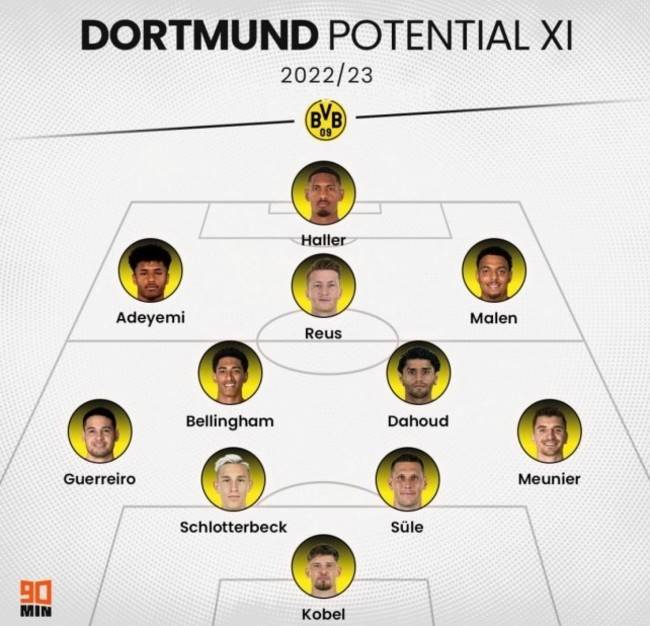 영국 '90min'은 4일(한국시간) 공식 SNS 채널을 통해 2022-23시즌 도르트문트가 가동할 수 있는 예상 라인업을 공개했다.