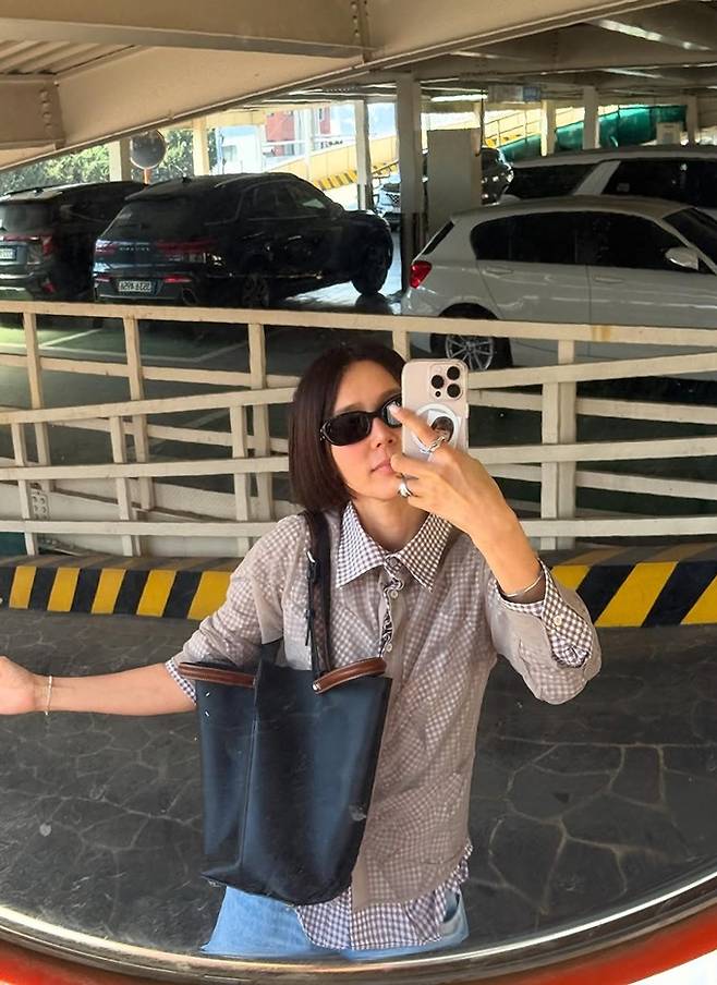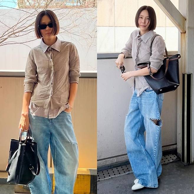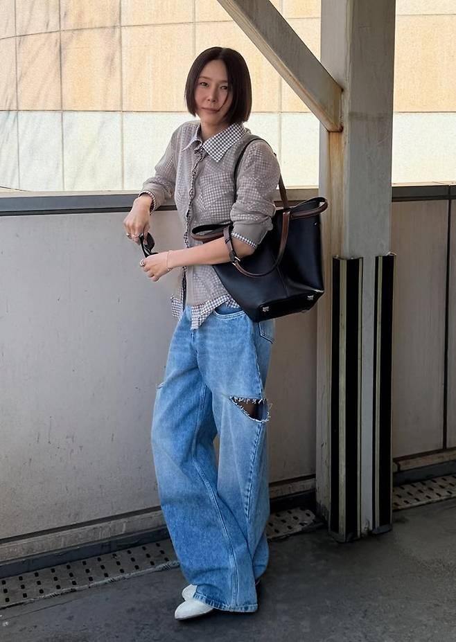 공개한 사진에서 김나영은 찢어진 하이엔드 데님 팬츠에 체크 셔츠를 입고 다시 오간자 셔츠를 레이어드룩으로 힙하면서도 센스있는 외출룩을 선보였다.