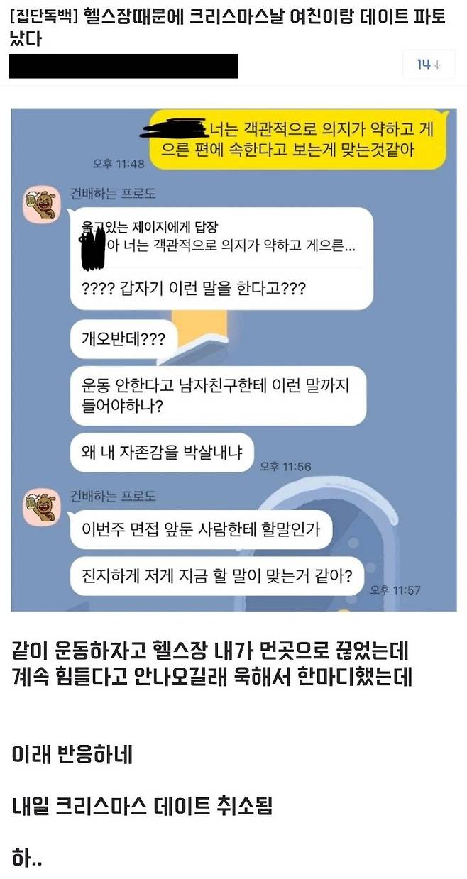 헬스장 때문에 크리스마스에 여자친구랑 데이트 취소된 남자