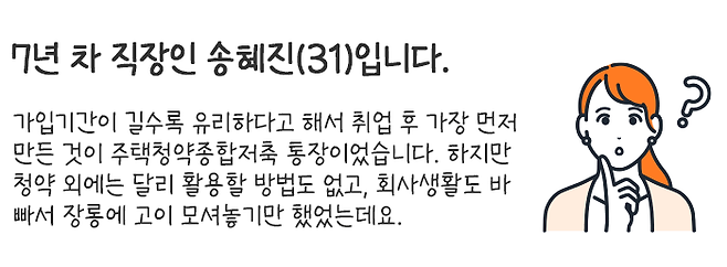 이런 이유로 우리나라 성인이라면 대부분 취업 후, 제일 먼저 만드는 게 청약통장이었을 것입니다.