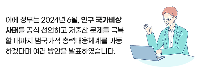 2006년 유엔 인구포럼에서 한국의 저출산 현상이 지속되면 ‘지구에서 사라지는 1호 인구소멸국가’가 될 것이라는 경고가 나왔고, 저출산 문제는 이제 발등에 떨어진 불똥이 되었습니다.
