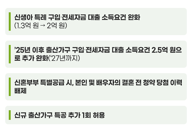 그리고 3년 동안 아이를 가지는 부부는 합산 소득이 2억 5,000만 원을 넘지 않으면, 최대 5억 원까지 신생아 특례 구입 대출과 전세자금 대출을 최저금리 연 1.2%에 받을 수 있습니다. (단, 2025~2027년에만 한시적 시행)