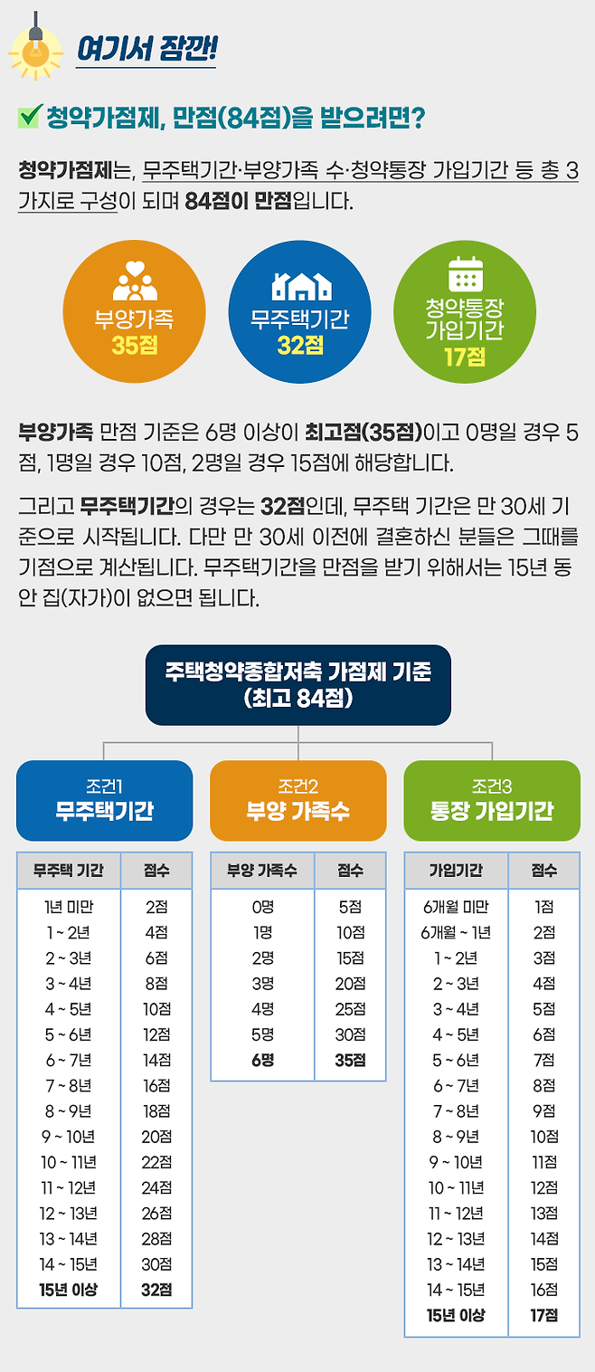 게다가 청약통장 전체 가입자의 70% 정도가 1순위 자격을 가지고 있다 하니, 청약통장이 더 멀게만 느껴졌을 수도 있습니다. 입지 조건이 좋은 청약에서는 만점자(84점)가 종종 나오기도 하죠.