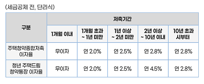 납입원금 5,000만 원 한도 내에서 신규가입일로부터 2년 이상인 경우 가입일로부터 10년 이내에서 무주택인 기간에 한하여 기존 ‘주택청약종합저축’ 이율(2.8%)에 우대이율(1.7%)을 더한 이율을 적용합니다.